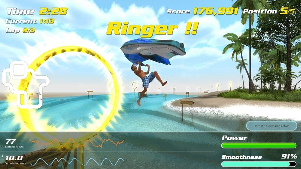 Tropical Heat is a major step forward in the field of heart rate feedback. Top notch graphics and animation, online multiplayer racing, extreme trick combinations, realistic scenery and water, and a wide variety of achievements and game play modes keep the game fun and teach you greater inner control of your heart rate and stress levels.