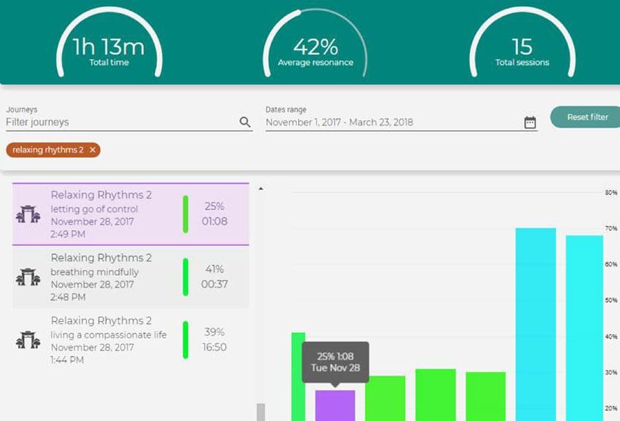 After each session, you will be presented with a summary of your results, including time spent, average heart rate, and average Resonance Score.